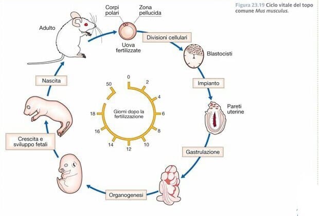 Come si può vedere dall’immagine ritroviamo gli stessi termini per indicare fasi analoghe nello sviluppo di altri animali, qui vediamo lo sviluppo di un topo (Mus musculus) che passa per le fasi embrionali (zigote, blastula, gastrula ecc), per la fase fetale, per la nascita e culminando poi con la fase adulta.