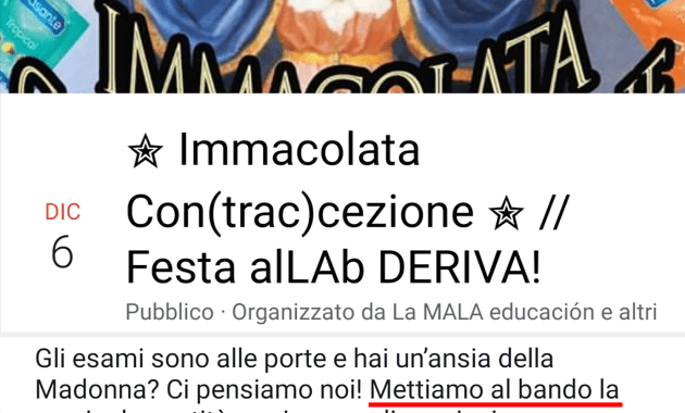 “Immacolata contraccezione”: il party blasfemo dei collettivi universitari Abbiamo appreso con sgomento che vari collettivi universitari di Bologna, in particolare “LA MALA Educacion, Uni LGBTQ, Rethink- Collettivo di Economia e Link”, all’interno delle strutture universitarie hanno organizzato […] Redazione 8 dicembre 2019 Lascia un commento