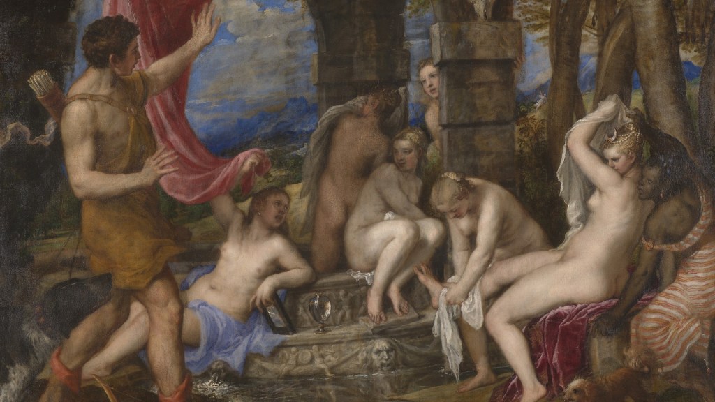 Diana, dea della caccia e della castità, è raffiguarata, insieme alle sue ninfe, nel momento in cui viene sorpresa da Atteone a fare il bagno. Come punizione per aver guardato, seppur involontariamente, il casto corpo della dea, il giovane verrà trasformato in cervo.